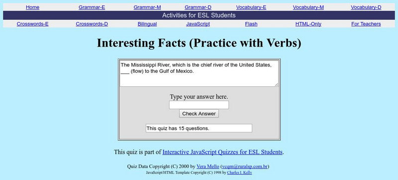 Fifteen questions to test your knowledge of verb usage with interesting facts. You fill in the correct answer and if you're correct, the next question is displayed. If you're wrong, the computer lets you know immediately by offering the...