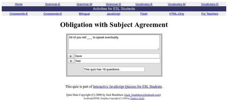 This site from The Internet TESL Journal provides twenty questions to test your knowledge of proper verb usage for has or have. You choose the correct answer and if you're correct, the next question is displayed. If you're wrong, the...