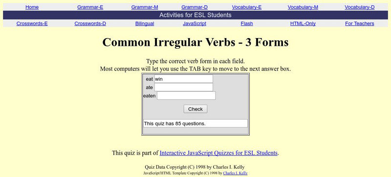Eighty-seven questions to test your knowledge of irregular verbs. You choose the correct answer and if you're correct, the next question is displayed. If you're wrong, the computer lets you know immediately, then offers answer but lacks...