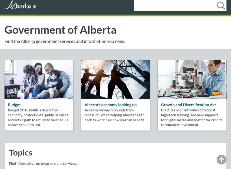 The Alberta government homepage offers links to current and historical information about the government of Alberta, its structure, policies, and initiatives.