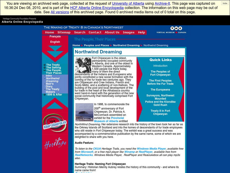 A website about the oldest community in Alberta, Fort Chipewyan, which currently is made up of people reflecting the original founder's ethnic background- Cree Indians, French and Scots Metis and non-Natives. This web page is based on an...