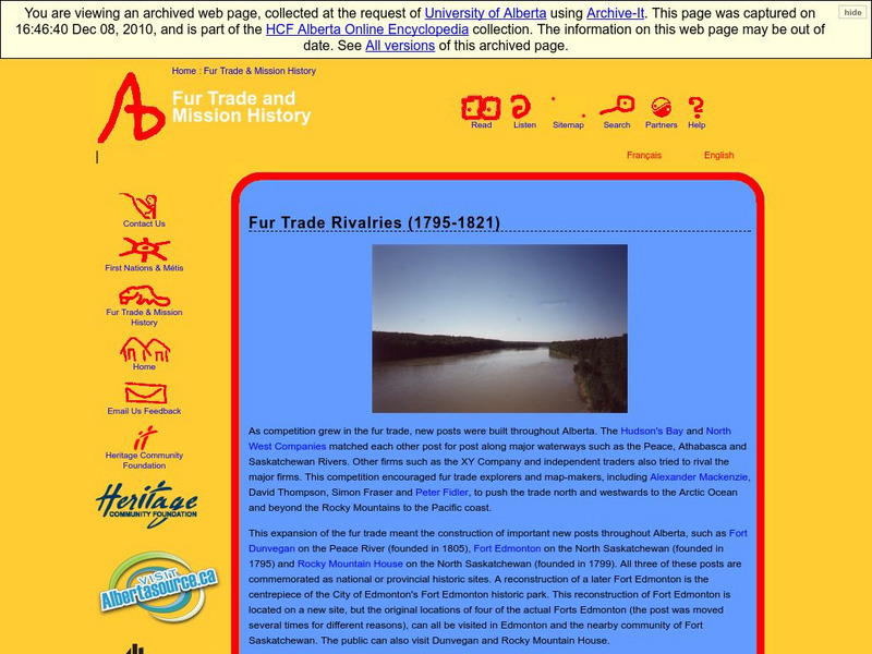 This Alberta Online Encyclopedia offers a website devoted to fur trading and mission sites in Rupert's Land, the area that would become part of Alberta. Listing nine separate sites, there are pictures, and an audio link to the "Heritage...