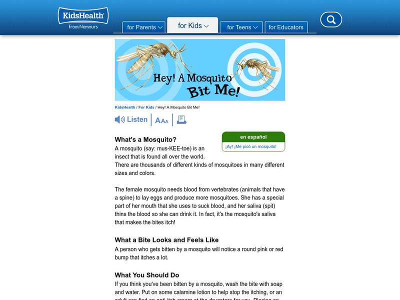 Do you know why a mosquito bite itches? Find out here at this Kids Health site. Also read some more about the mosquito, what a bite looks and feels like, and what to do if you're bitten.