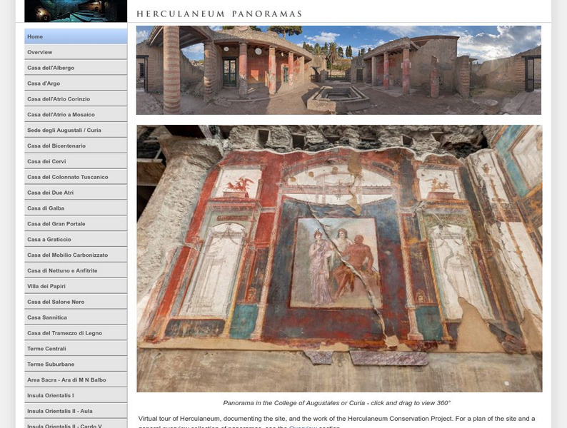 A virtual tour of Herculaneum, one of the towns destroyed when Mount Vesuvius erupted in 79 AD. Click on the blue dots on the map, or the tabs on the left to access the virtual tour of the excavated site.