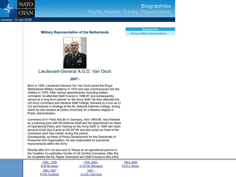 Gives the curriculum vitae (document of personal experiences and qualifications) for Lt. General A.G.D Van Osch, the Netherlander military representative to NATO.
