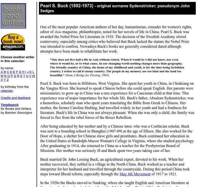 Biographical information detailing Buck's life and accomplishments, discusses "The Good Earth," lists selected works, and film adaptations.