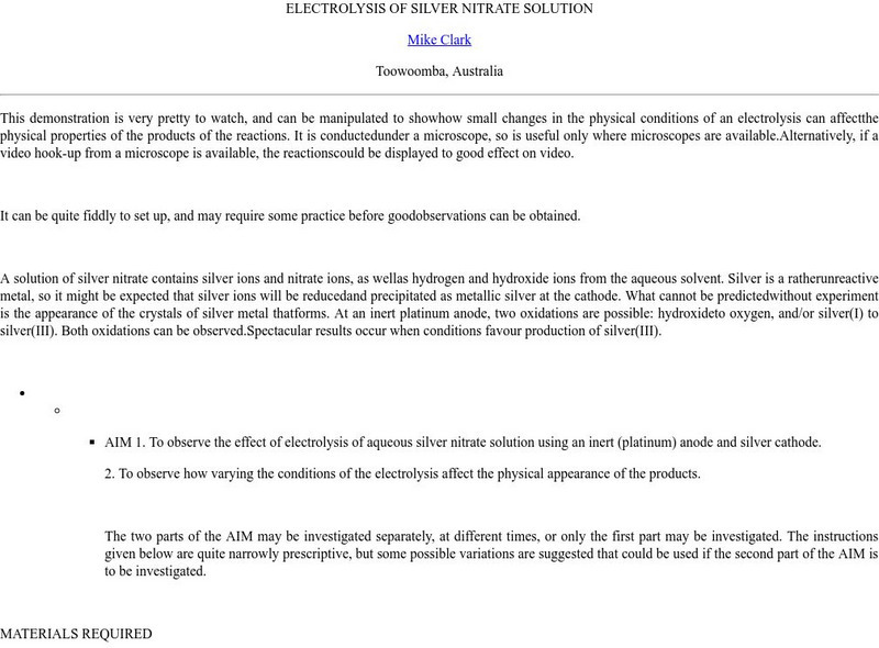 Complete directions for a teacher demonstration in which the electrolysis of a solution of silver nitrate is viewed under a microscope. Helpful tips and a diagram of the apparatus and set-up is provided. Easily adaptable as a student lab...