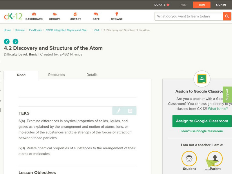 [Free Registration/Login may be required to access all resource tools.] Students learn about the important discoveries of subatomic particles, and how they led to our current understanding of the atom.