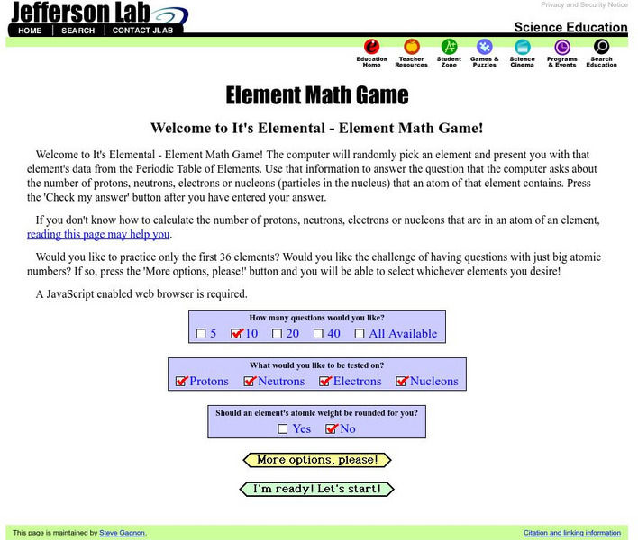 Learn how to read the periodic table of elements as you solve these Math questions about the number of protons, neutrons, electrons or nucleons in an atom of an element. You can choose how many questions to answer, and how complex they...