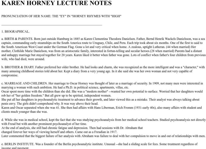 Lecture notes from a psychology professor. Excellent site for capturing the main topics relevant to Karen Horney and her theories - biography, relationship to Freudian psychology, explanation of all major terms and theories, development...