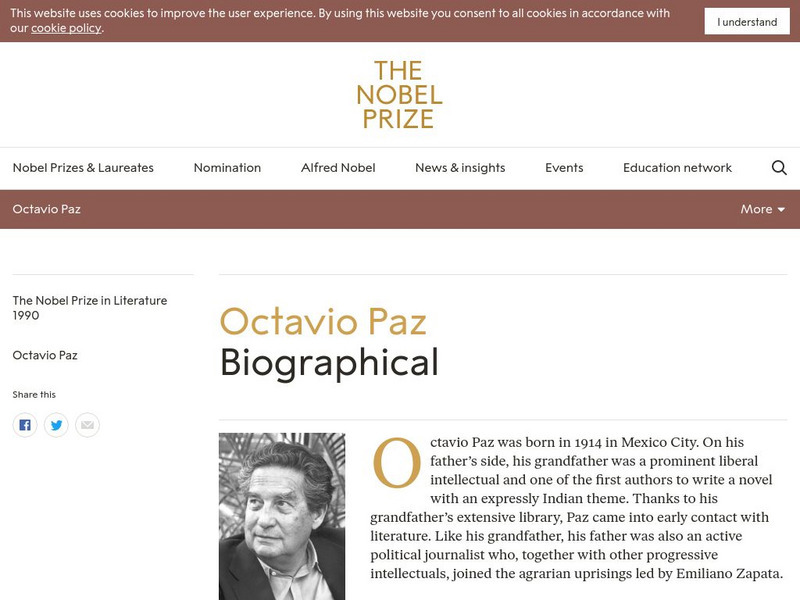 Read about the winner of the 1990 Nobel Prize in Literature, Octavio Paz. This Nobel E-Museum website includes a biography, poetry, Paz's Nobel lecture entitled "In Search of the Present," and many other resources.