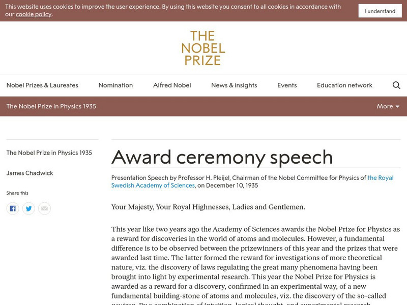 The Nobel Physics Chairman made this speech when presenting the Prize to Chadwick. It clearly explains the importance and depth of Chadwick's work. Site by Nobel e-Museum.