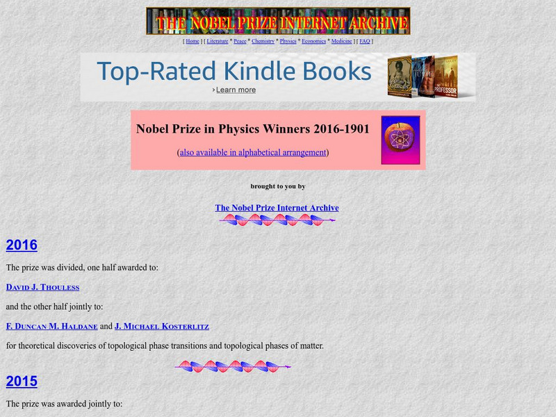The Nobel Prize in Literature website describes the prize and its past winners. Includes information on the authors, as well as acceptance speeches.