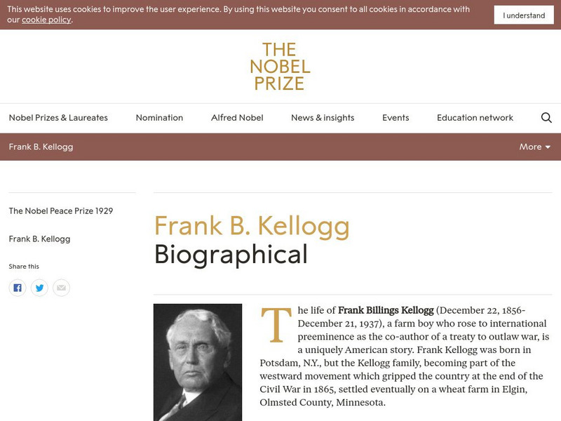 At this site from the Nobel e-Museum, you can learn about the 1929 winner of the Nobel Peace Prize, Frank Billings Kellogg. This website, in addition to including a biography, provides texts of the Nobel Prize "Presentation Speech" and...