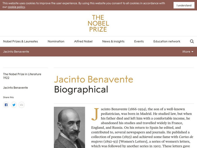At this site from The Nobel Foundation you can read about the life and literary works of Jacinto Benavente, a Spanish writer honored primarily for his drama.