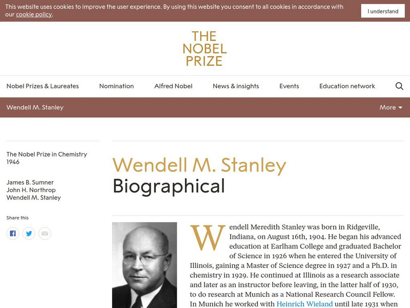 This is a brief Nobel E-Museum biography on Wendell Meredith Stanley, the scientist and co-recipient of the 1946 Nobel Prize in Chemistry.Read about his education, as well as his contributions to various scientific studies through which...