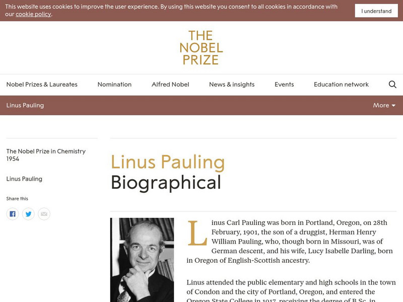 The Nobel Foundation provides a biography and image of Linus Pauling, winner of the 1954 Nobel Prize for Chemistry.