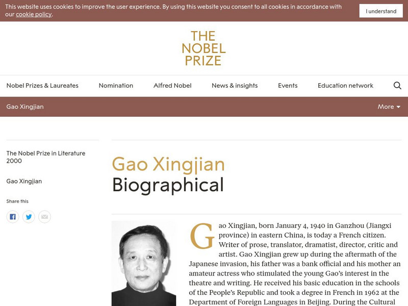 This Nobel Prize site offers a brief biographical sketch of the 2000 Nobel literature prize winner, plus a list of his works of works about him. Also provided are links to an interview with Xingjian, videos, a bibliography of his works,...