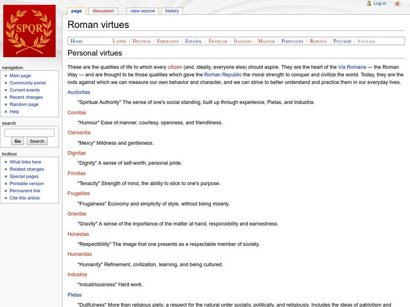 A list of all the virtues that the ancient Romans felt were necessary. This page links to many other site about Roman history.