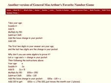 In this number game, students use algebra to prove this age and change in your pocket number guessing game. Students end with a number where the first two digits are their age and the last two digits are the change in their pockets.
