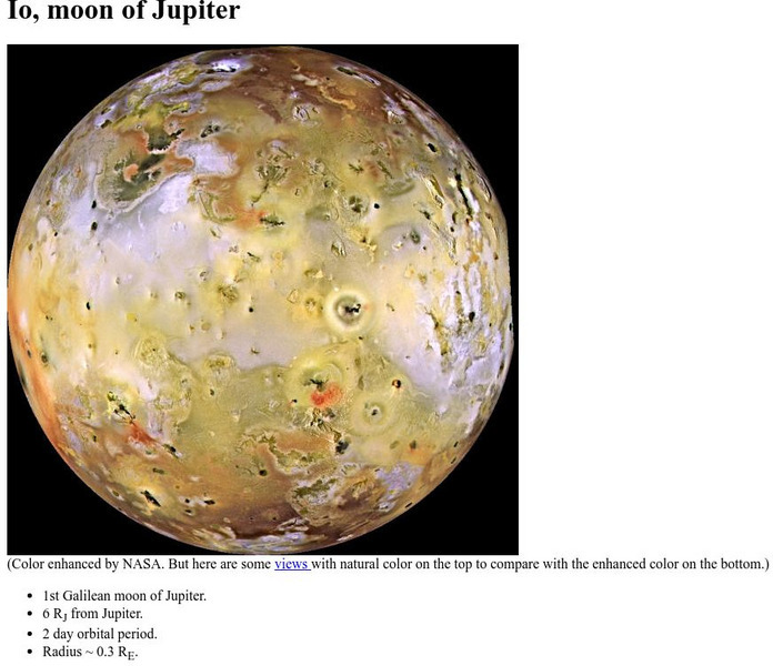 Statistics and general information about the volcanic moon of Jupiter. Good comparison, with graphics, of Io's volcanoes and Earthly geysers.
