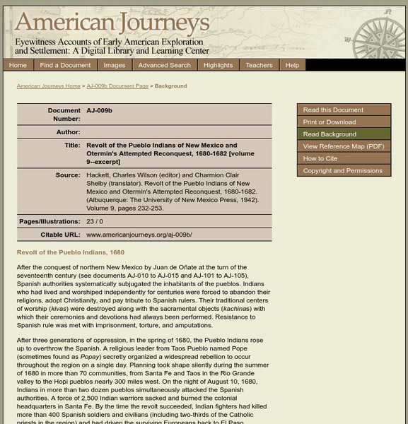 Read the background of the Pueblo Revolt of 1680 before accessing the document which is a translation of an excerpt of a book titled Revolt of the Pueblo Indians of New Mexico and Otermin's Attempted Reconquest, 1680-1682. This document...
