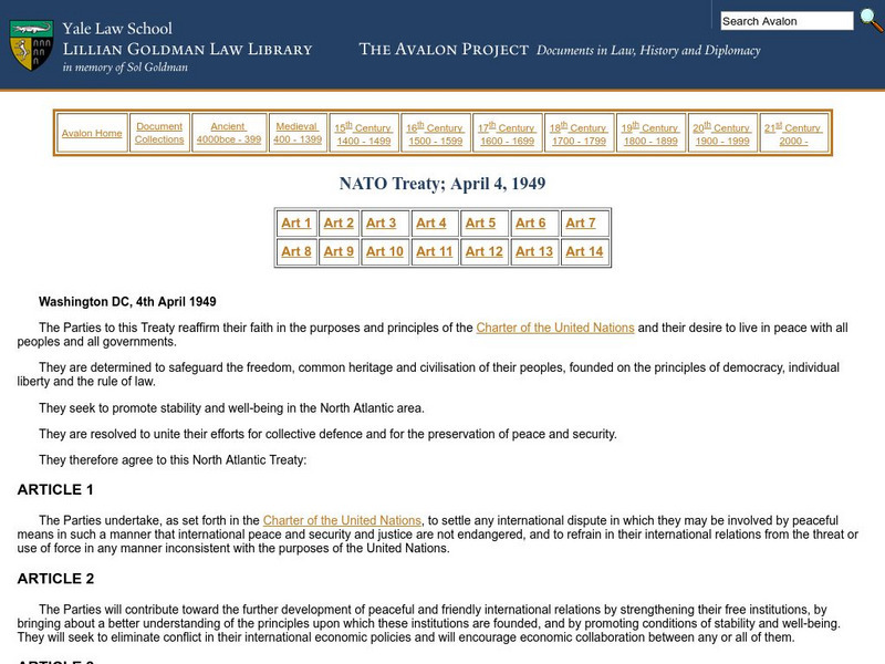 Contains the actual text of all fourteen articles of the North Atlantic Treaty.