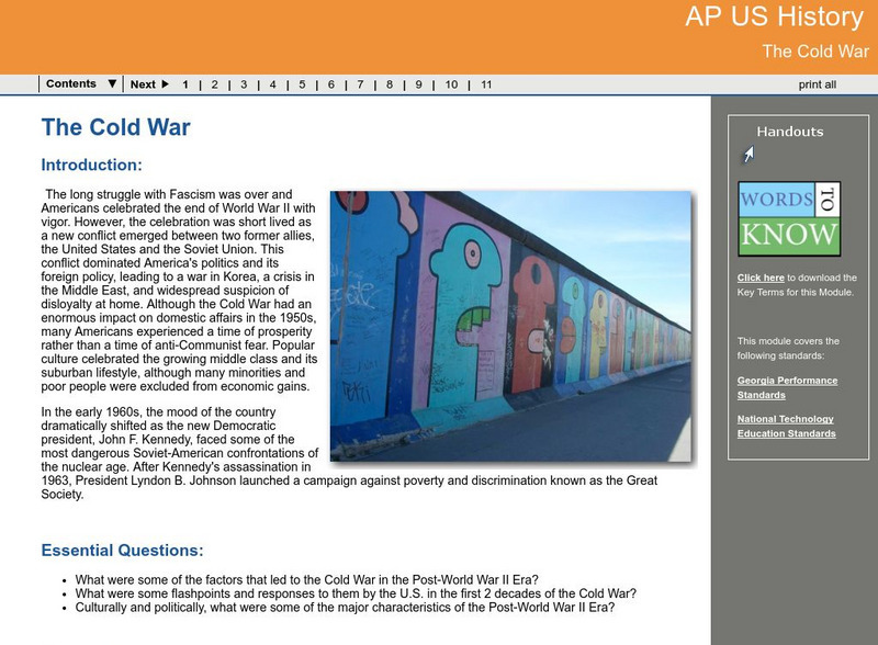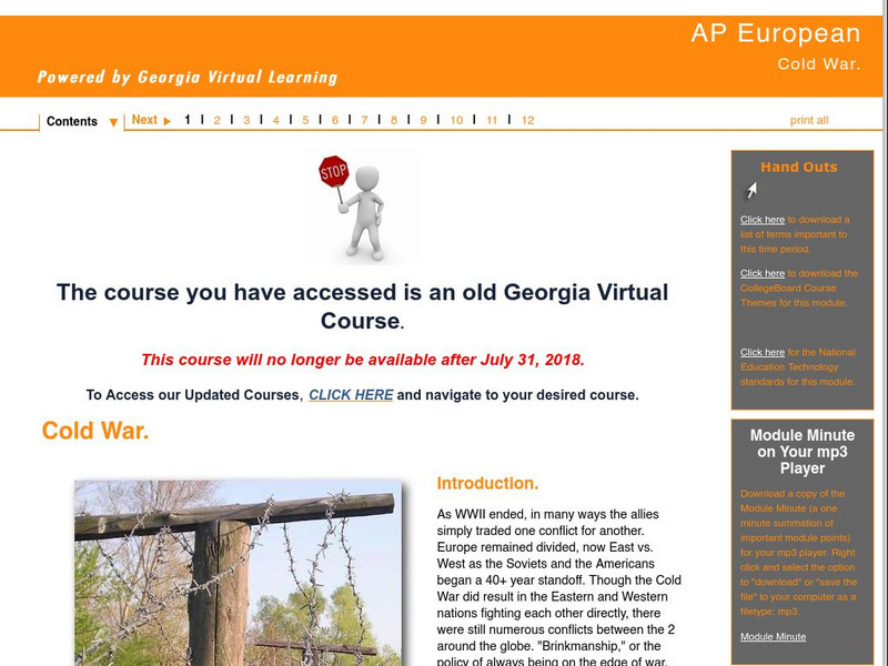 Learning module for AP European History on the Cold War provides comprehensive course materials including text, photos, assignments and assessment as well as nteractive features and collaborative art project.