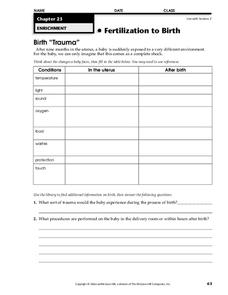 In this fertilization to birth process worksheet, students think about the changes a baby faces and complete the table on birthing trauma. They describe what type of trauma the baby might experience during the process of birth and what...