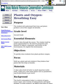 Second graders gain an understanding of how plants produce oxygen and that the oxygen we breathe comes from trees and plants. After a lecture/demo, 2nd graders discuss the ways plants produce oxygen and the detrimental effects of cutting...