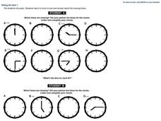 In this math worksheet, students work in pairs asking and answering missing times on clocks. Two cards are included for both students. Each card contains eight clocks. Student A reads a time on his/her card while student B completes a...