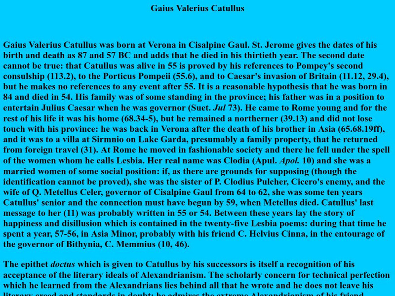 Good introductory biography of the Roman poet Catullus. Explores not only the man but his work as well, focusing on the influence of Alexandrian and Hellenic poetry on his own poetry. Cites his poems as support for the facts of his life.