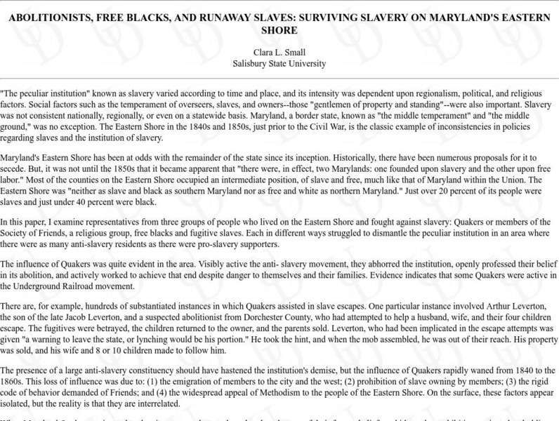 Read about the groups of people who lived on the Eastern Shore of Maryland in the mid-1800s and fought against slavery: the Quakers, former slaves, and fugitive slaves. This article describes the efforts of both whites and blacks, who...