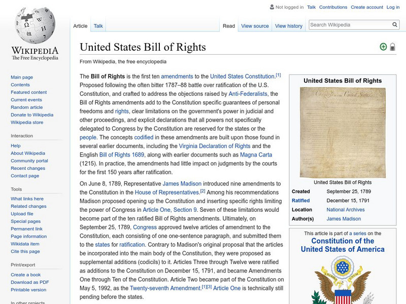 This encyclopedia article from Wikipedia gives some background history to the creation of the Bill of Rights and contains a transcription of the first ten amendments to the Constitution in their original form.