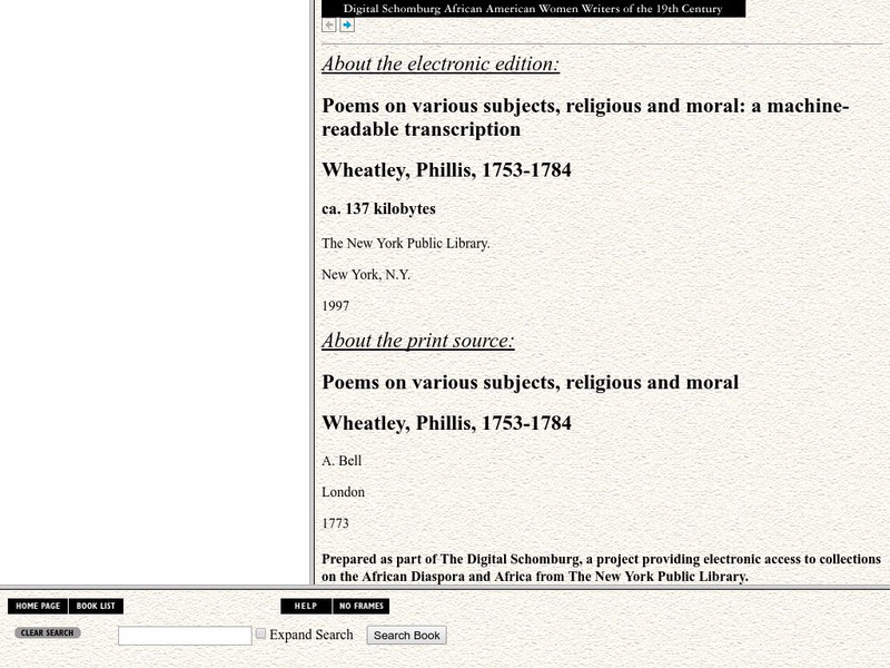 A collection of poems by Phillis Wheatley available as an entire online text. Search by specific poems. With preface and illustration.