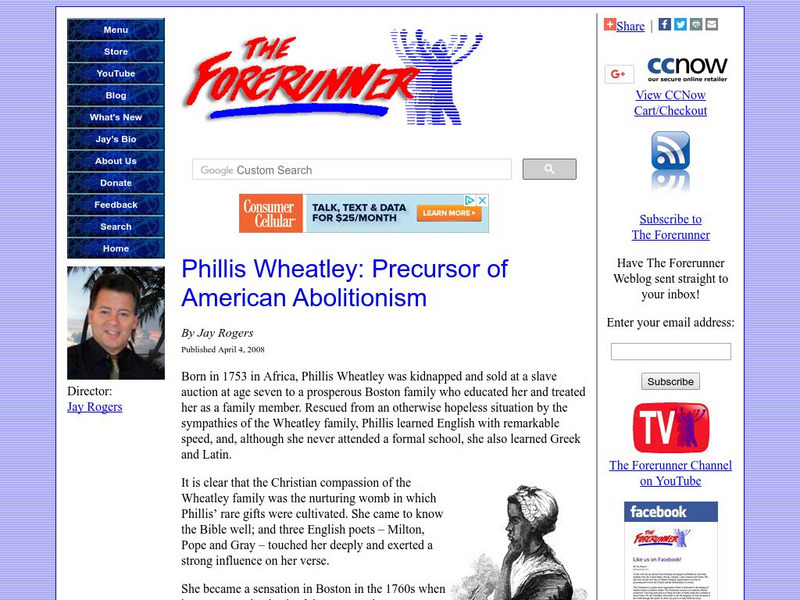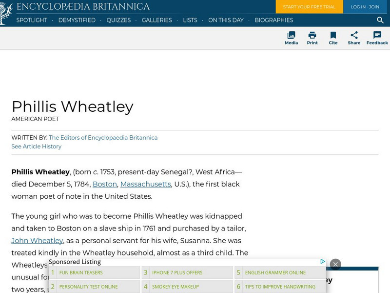 Read a biography of Phillis Wheatley, along with poems and letters written by her.