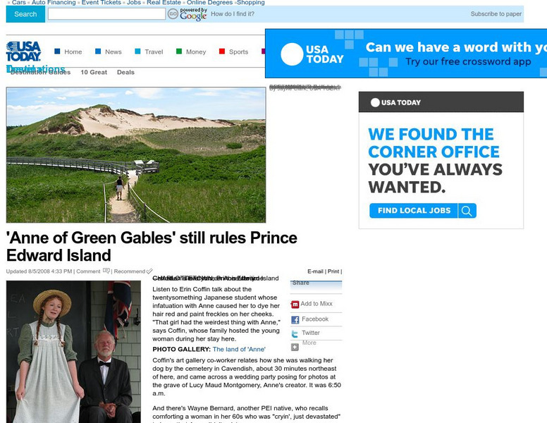 This news article, dated August 5, 2008, talks of the importance of Anne of Green Gables to Prince Edward Island's tourism industry, although many islanders seem to have tired of the attention still given Green Gables as a tourist...
