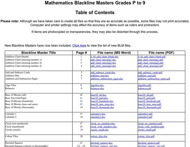 Templates that are widely used in elementary to middle school Math are found here. There is a wide assortment of everything from hundreds charts to graph paper to 3-D nets. They are available in both Word and Adobe Acrobat formats.