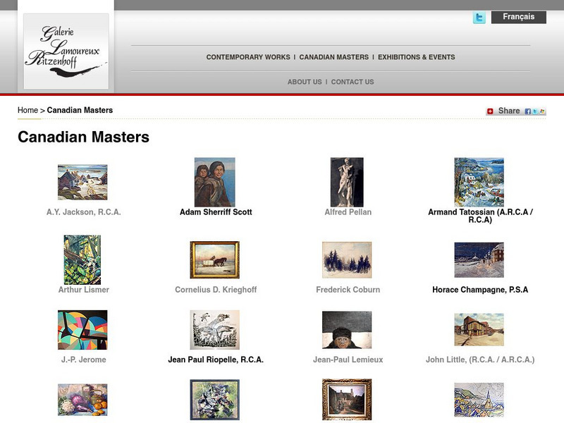 A Montreal Art Gallery offers images of works by Canadian master painters such as Casson, Krieghoff, Lismer, Riopelle, Pellan, and many others. By clicking on each picture, many of the artist's works are revealed.