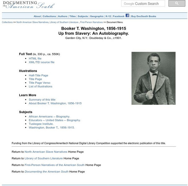 Read the complete text from the book "Up from Slavery: An Autobiography", by Booker T. Washington, in which he explores his journey from slave to educator. Includes illustrations, biographical facts, and links to further information on...