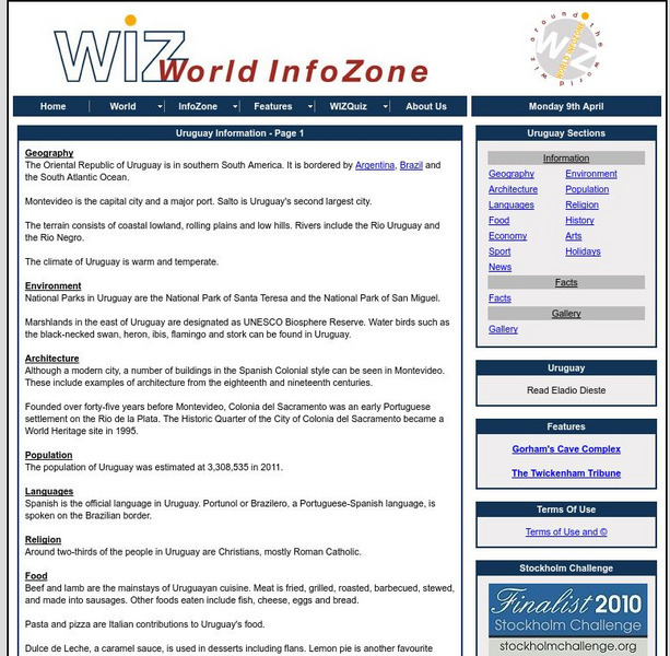 Thorough overview of information on the South American country of Uruguay. Subjects include geography, architecture, languages, food, economy, sports, environment, population, religion, history, arts, and holidays. Be sure to look at the...