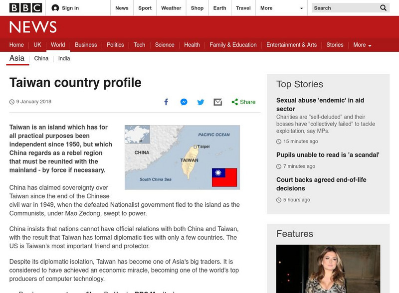 BBC News features a general overview of the East Asian country of Taiwan. Focus is on history, country facts, leaders, and media. Provides links to a timeline of key events and recent news articles.