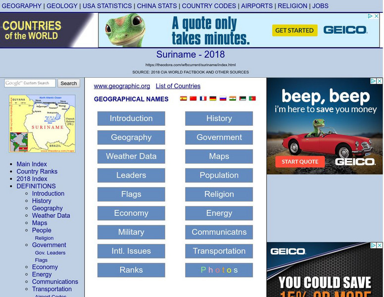 Comprehensive country-specific information compiled from a variety of sources. Explore Suriname's geography, population, climate, people, government, economy, communications, international issues, religion, and more. Be sure to click on...