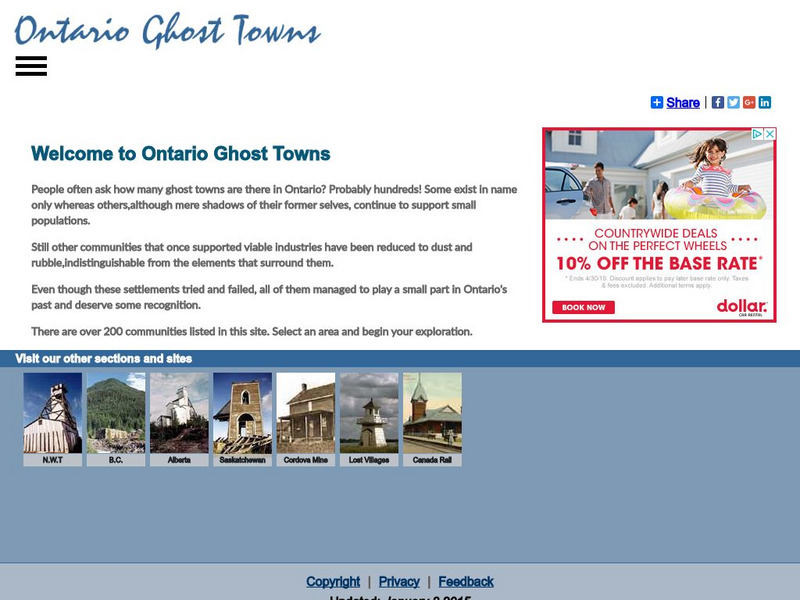 Explore Ontario's ghost towns through this interactive website! Learn the stories of the many ghost towns in the province through both narrative and photos. Maps are also provided.