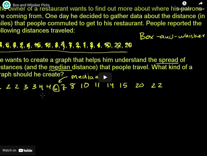 Video demonstrates how to create a box-and-whisker plot from a set of data. [13:14]