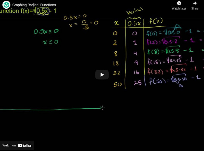 Video showing how to graph a radical function by specifically choosing values for x that result in easy-to-plot values of y and then plotting the points. [10:17]