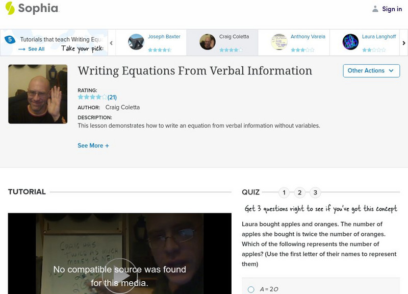 Students watch a video lesson that demonstrates how to write an equation using only verbal information. The tutorial includes detailed examples.