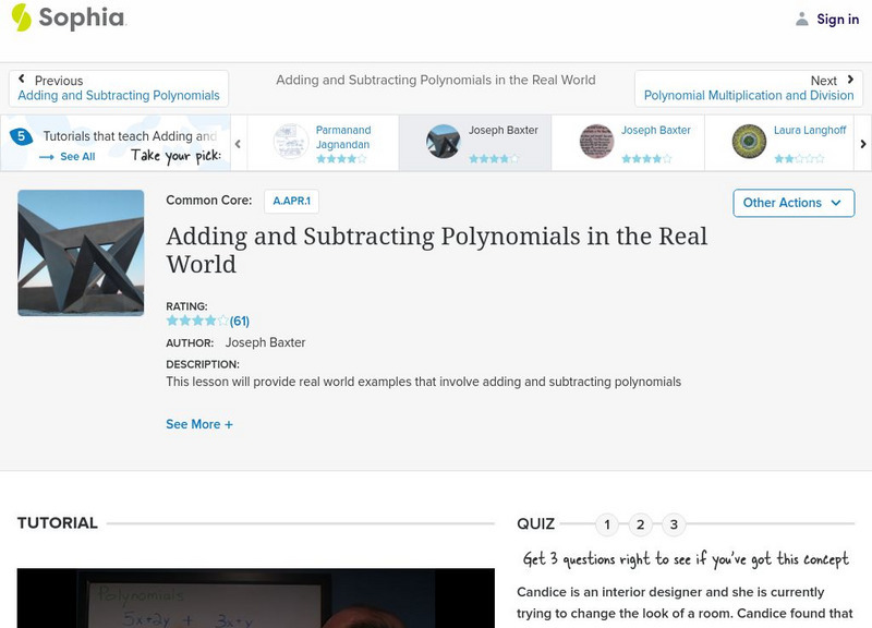 The mathematics resource includes a video tutorial about polynomial applications. The lesson discusses polynomial addition and subtraction in real world examples.