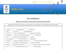 Helpful as a print-out or electronic worksheet, this verb tense worksheet prompts middle and high schoolers to fill in 20 missing first conditional verbs in sentences. They can check their answers and receive hints. The activity would be...