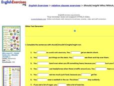 Four short exercises give learners the opportunity to review relative clauses including should, might, who, which, or that. They complete a fill in the blank activity first before forming complete sentences from a collection of phrases...